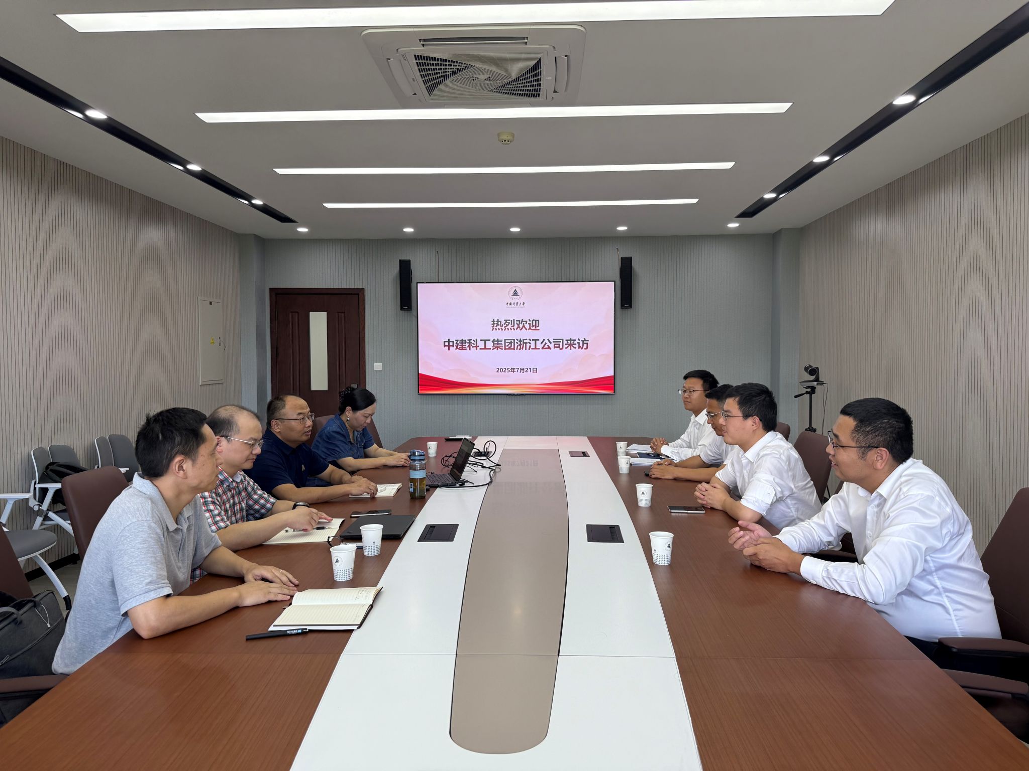 2025年7月21日,中建科工集团浙江公司党总支副书记杜慧伟、总工季泽华、安全总监袁彦涛一行来校交流,围绕校企党建共建、碳计量、工程安全管理及应急能力等多领域开展深入交流。能安学院院长徐鹏、学术副院长张明、安全工程研究所所长刘辉、能源与动力工程研究所支部书记严微微出席座谈会。