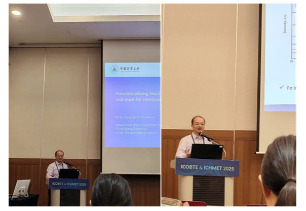 我院张明老师受邀参会,并在生物炭分会场做题为 “Functionalizing biochar by Co-pyrolysis shaddock peel with red mud for removing acid orange 7 from water”的主题报告(Keynote)。报告中,张明系统梳理了生物炭领域研究的进展以及存在的问题,介绍了团队在功能化生物炭制备及水污染治理领域的最新研究成果,详细阐述了以农业废弃物柚皮和工业固废赤泥为原料,通过共热解技术制备功能化生物炭的工艺原理,以及该生物炭在去除水中难降解有机污染物过程中的性能表现、作用机制与应用潜力。并和与会专家展开深入交流,为研究成果的进一步完善提供了宝贵思路。